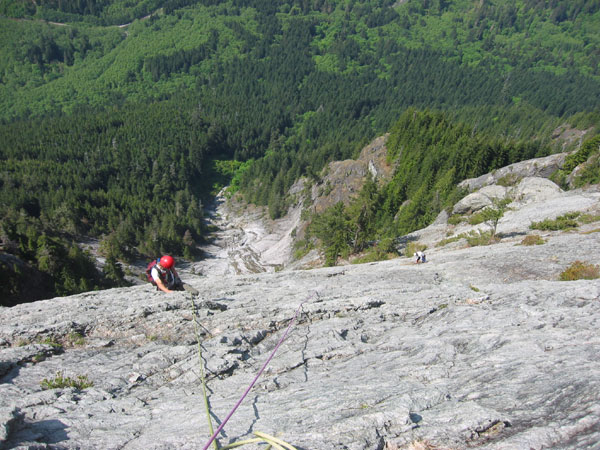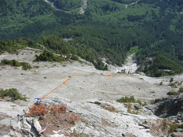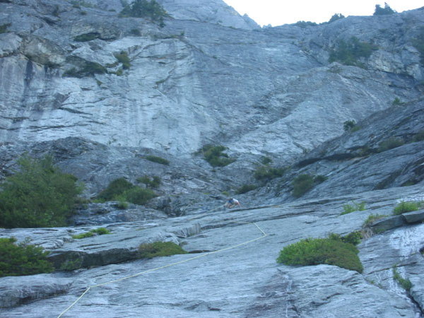 climbs a short 5.7 wall, then eases off into low angled slabs again. Above